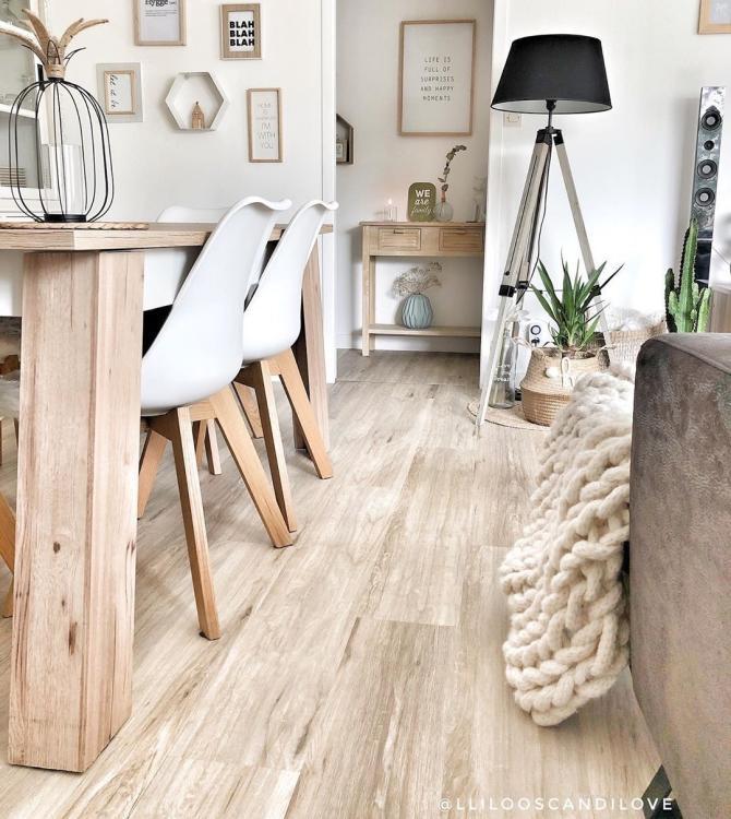 Ela recorreu aos serviços da Gerflor porque queria refazer o chão da sua sala de 55m². Apaixonada pela coleção Senso Premium Clic, optou pelas tábuas com efeito madeira Authentic Blond e instalou-as sozinha.